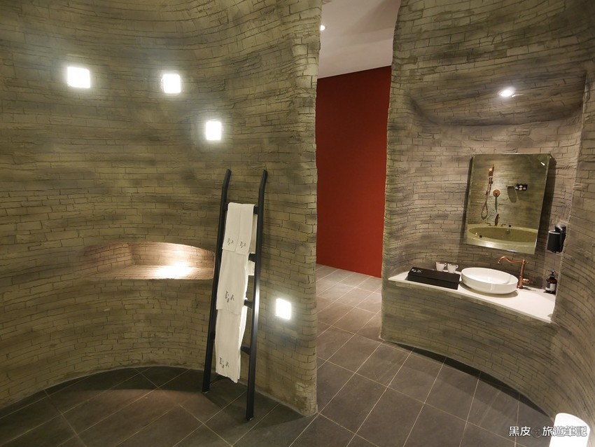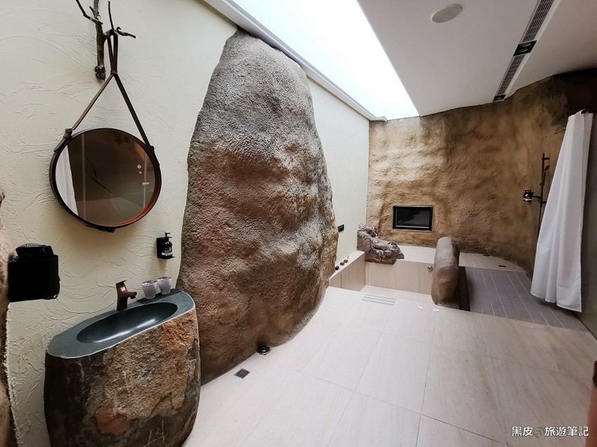 山洞的視覺延伸至衛浴間,真的只差在沒有穿上原始人的服裝