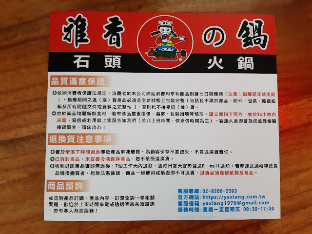 總結:雅香石頭火鍋食材新鮮,肉品的品質都很棒,還有獨門沙茶襯托,每樣食材包裝上都清楚標示製造日期、保存期限、產地、保存方式......等,食材資訊公開透明,吃得安心。夏天不想出門只想待在家裡吹冷氣,上網下單就宅配到府,整個很可以,推推^^。