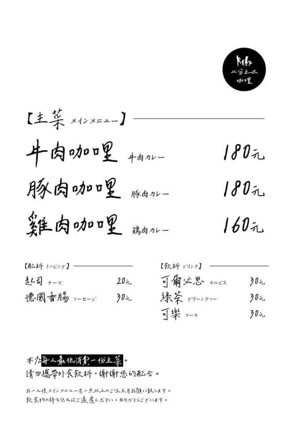 菜單主要販售三款咖哩飯,另有配料加價購,還有三款的飲料選擇,選擇真的不多,希望之後再訪會有更多新選擇,然後低消每人為一份主食!