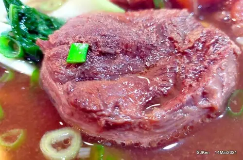 二月中旬路經這家位於台北市伊通街110號,生意鼎盛的「台灣牛」麵食點心店家,早年以黃牛肉的牛肉麵起家,後來因為台灣本土牛養殖日減,以及美牛疫症風波之後,店家近年改用進口澳洲牛肉,店內餐點概分成「湯麵類」、「乾麵類」、「湯類」、「小菜」與「飯類」,麵類主打蔥燒牛肉麵、牛筋麵、半筋半肉、三寶(牛肉、牛肚與牛筋)、牛肉乾拌麵,與牛肉湯麵,牛肉麵系列外,還有雞腿麵、排骨麵、貢丸麵、肉絲麵與肉燥乾麵,飯類則包括排骨飯、雞腿飯、豬腳飯等等,提供來客豐富多選的餐點,另外還有多款小菜放在櫃內,由客人自行選取,當晚點了一盤小菜「豆乾、滷蛋與海帶」(NT$35/盤)跟一碗「牛肉麵」(NT$140/碗),一共是NT$175。
