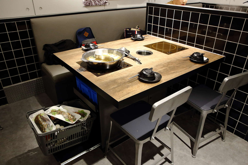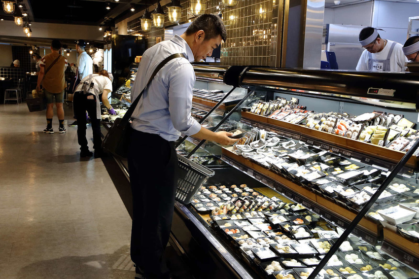 結帳時就跟在超市購物一樣,店員拿著嗶嗶器刷食材盒上的條碼,然後服務員會帶入座位區