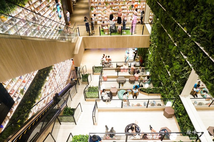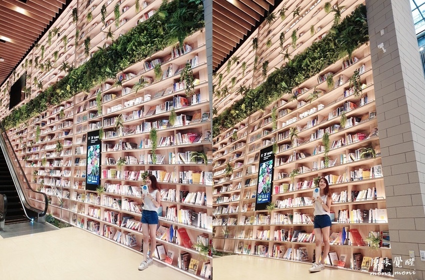 從一樓延伸到二樓,挑高15米的巨型書牆,看到時真的覺得好壯觀呀!尤其以階梯式、手扶梯式的設計方式,更方便人可以自由取閱,在慵懶地在一旁坐著觀看,有著綠色植栽交織其中,完全是讓人想趕緊拍照的網美牆,難怪假日人潮如此之多,真心覺得設計的好用心好美唷~~不輸給韓國版本。