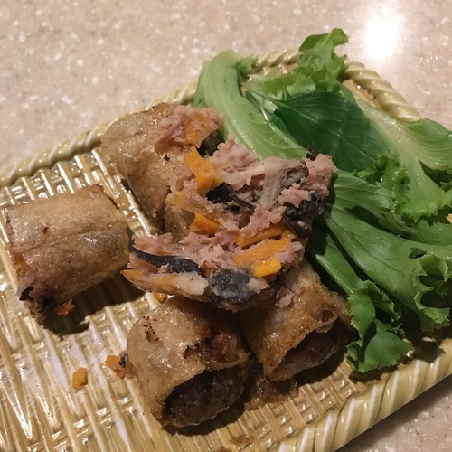 *🔸旁邊附些生菜和九層塔,兩條炸春捲會切成6小塊,春捲裡有豐富的料,有木耳、洋蔥、地瓜和肉末,可惜外皮炸時間過久以致太過酥脆,牙齒咀嚼更久,而且麵衣會變成一小球的喳喳卡在牙縫裡,增添我剔牙的困擾 ⠀⠀⠀⠀⠀⠀⠀⠀