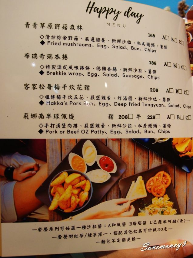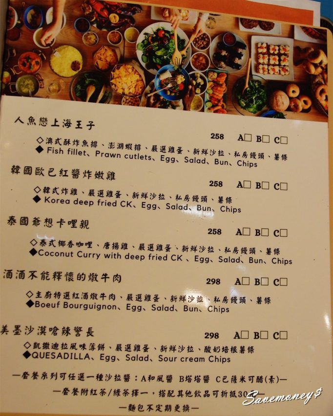 餐名後面的ABC代表可勾選不同的沙拉醬,A:和風醬, B:塔塔醬, C:巴薩米可醋