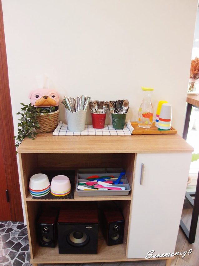 大門旁邊置物櫃,整齊疊放著各種刀叉和湯匙,旁邊的水壺讓客人自己DIY