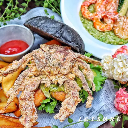 店家人氣招牌菜之一,美味的竹炭漢堡裡面給的是一整隻軟殼蟹