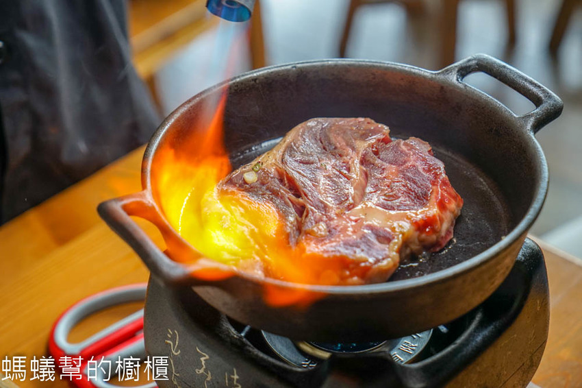 等到鐵鍋預熱足夠,將牛肉攤平放下煎烤,瞬間冒出的吱吱作響聲,伴著煙往上飄,聲音跟著變小,這時讓牛排外表煎至變色,翻面後再拿出噴槍,來上一記熟練的炙燒,還可邊欣賞炙燒過程。
