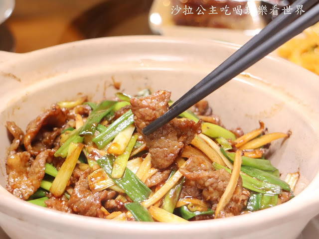 一打開鍋蓋就聞到香氣撲鼻,美國牛肉片過油後,以蔥段、薑條、蒜末爆香,加入蠔油、醬油、糖及紹興酒翻炒牛肉片調味,盛入炙燒砂鍋