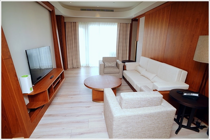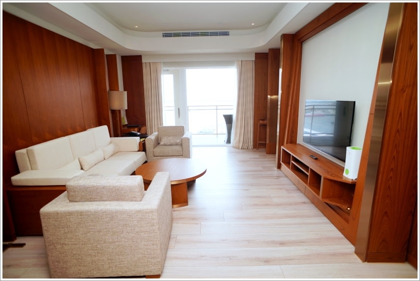 ▼港景菊島大使套房,這間足足有35坪這麼大,很適合當作蜜月或是特殊節日來度假的房型!這種房型每層樓都有一間,一進來就有一個超大客廳,如果朋友要來拜訪也沒問題!
