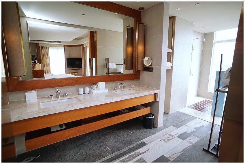 ▼洗手台的空間也相當大,一旁同樣放有各式備品、漱口水、漱口杯、乳液、香皂、刮鬍刀、牙膏牙刷、化妝棉、浴帽等,許多貼心小物通通幫妳準備好了!