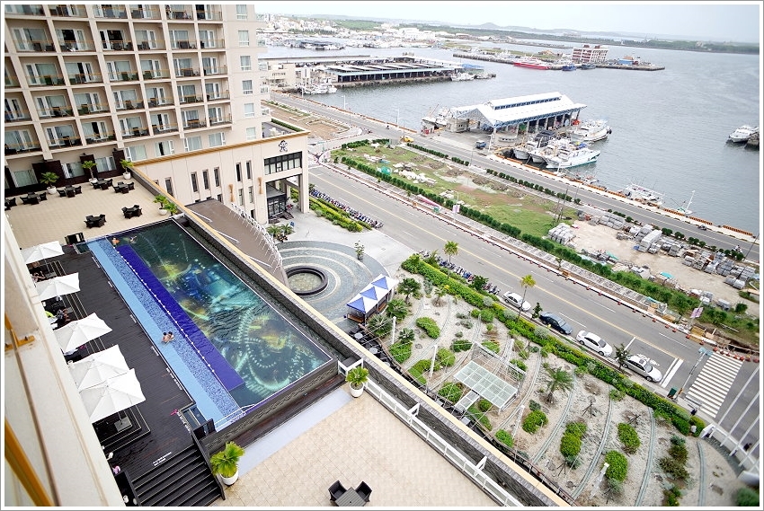 ▼看出去的景色也非常遼闊,除了可以看見整棟的建築物與澎湖的街景之外,還有無邊際泳池!