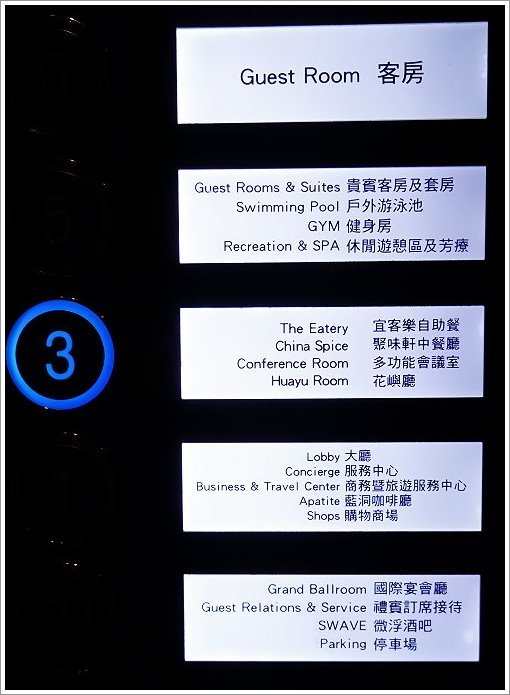 ▼電梯裡頭也有簡單的樓層介紹,大部份的餐廳、飯店設施都集中在1、3、5樓,B2樓則是國際宴會廳與微浮酒吧,都可以自由上下樓;只有客房所在樓層要使用房卡嗶嗶才能按,安全隱私上也頗為注重!