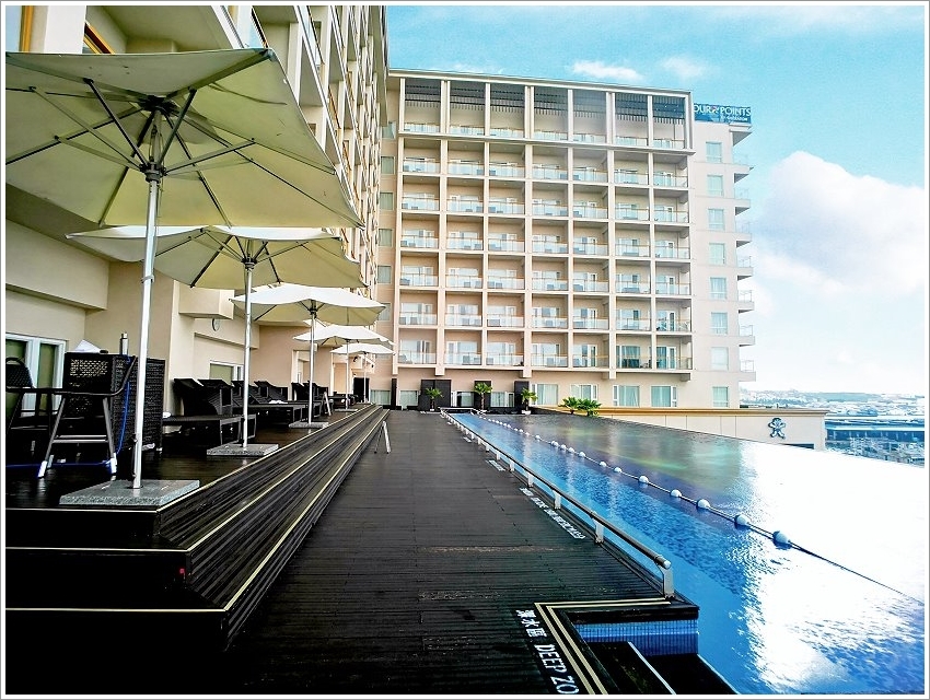 ▼看完房型後,接下來就是飯店設施啦!最特別的是他們家的無邊際泳池,一旁還有陽傘戶外躺椅,不管是來這裡日光浴或是游泳、玩水都很棒!