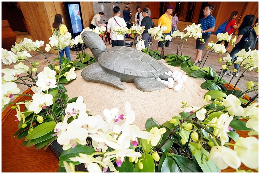 ▼大廳另一側還有一隻栩栩如生的綠蠵龜,也是在地藝術家採用澎湖特有的玄武岩所雕刻而成,後方還有一堆海龜蛋,看起來好可愛好療癒!