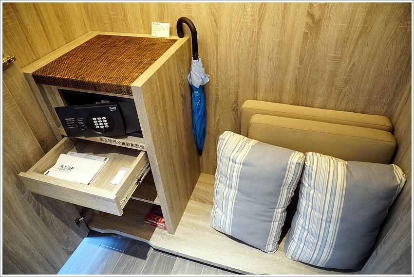 ▼櫃子裡頭除了衣架之外,也有保險箱、洗衣袋、雨傘、抱枕、靠墊等,有需要的朋友都可以自行取用!