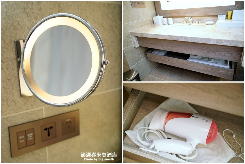 ▼洗手台旁還附有化妝鏡,上頭也有化妝燈,讓女孩兒可以輕鬆的化個妝!吹風機、地墊則是放在洗手台的下方,不是掛壁式的都好好用(笑)!