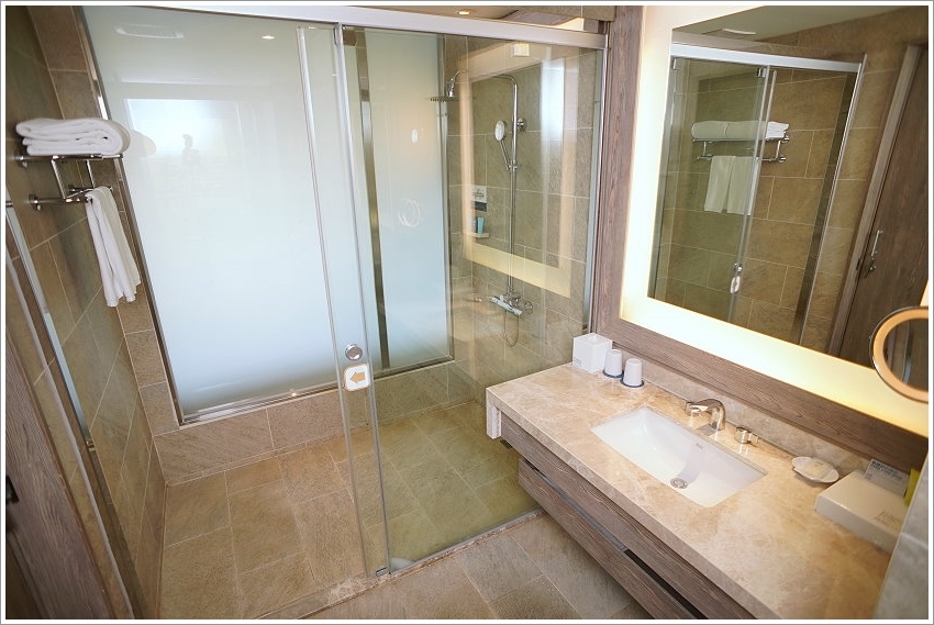 ▼客房搭配的是乾溼分離的淋浴間,同樣也有魔術玻璃設計,想要透明或是不透明的玻璃都可以自行調整!