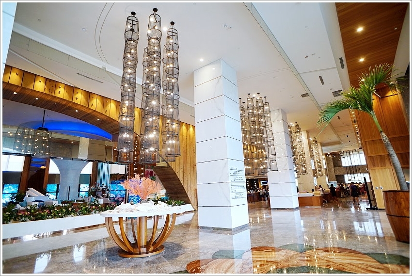 ▼「澎湖福朋喜來登酒店」以海洋元素為設計主軸,將澎湖的人文意象、地形特色等通通都呈現在酒店裡!像是一進來看到的櫃檯就是採用大船為意象,櫃檯的前方是船頭,船頭都會靠在港口立樁上,所以櫃檯的立樁上也有鉚釘設計,每個小細節都可以看見飯店的用心與巧思!