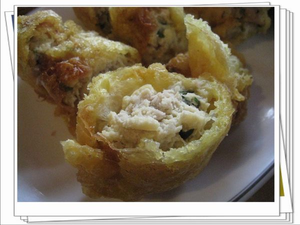 這一道是「桂花腐捲」,描述中說用「石碇著名的板豆腐和腐皮,加入蝦仁、絞肉以及桂花釀做為餡料,再用腐皮將之包裹成雞捲的形狀,油炸到金黃酥脆,沾上桂花醬料酥脆可口的美味」