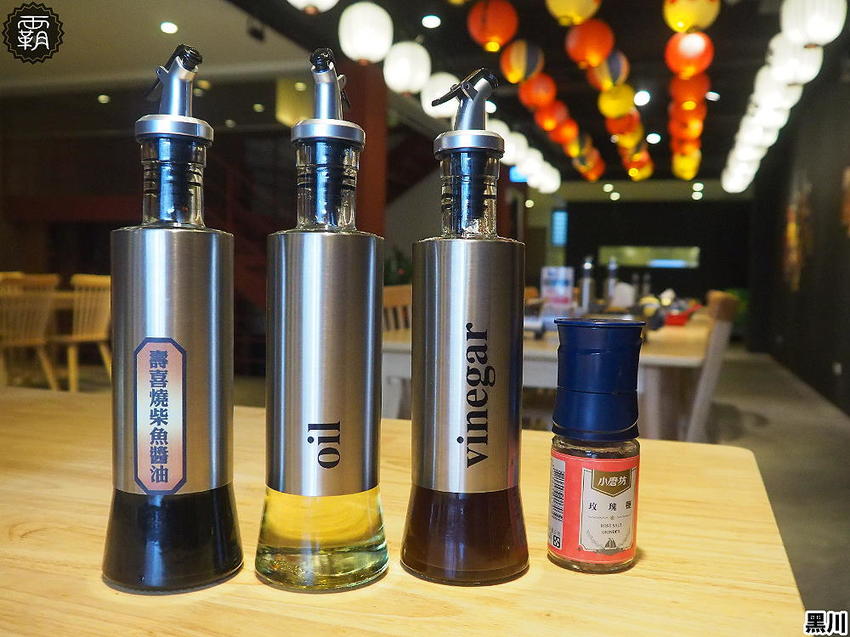 每桌都有提供餐點所需醬料,像是壽喜燒會用到的柴魚醬油、吃板燒需要的橄欖油、玫瑰鹽,另外還有淋沙拉跟高麗菜絲的和風柚子醬。