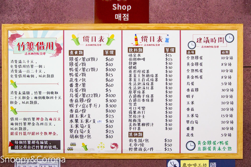 【清水地熱廣場】販賣部裡有清楚的價目表,還有建議煮食的時間,