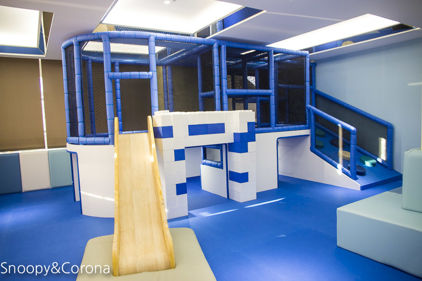 遊戲室採用藍白色調積木風格清爽又富有童趣,提供了許多遊樂設施。