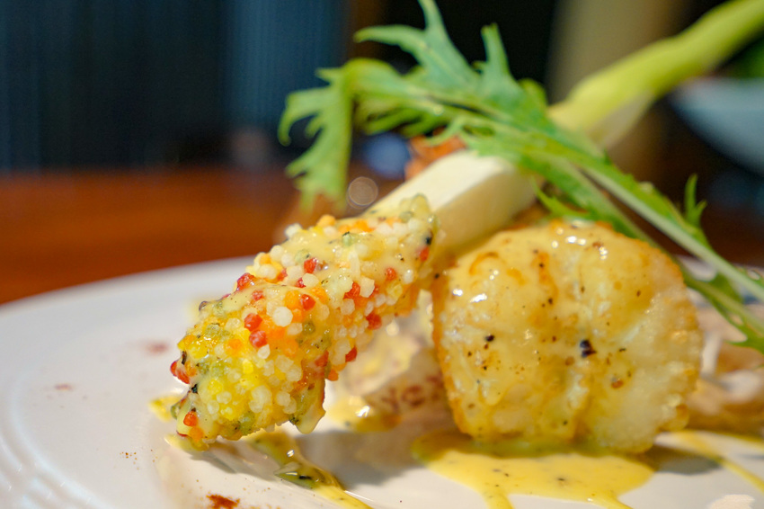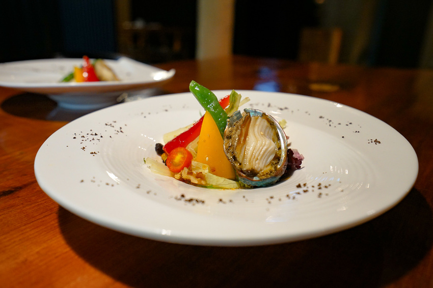 西餐常見的沙拉在雕之森樹屋餐廳的表現也不馬虎,除了生菜和紅黃椒外,劉師傅使用鮑魚作為主角,配上一些堅果和番茄,健康又好吃;另外值得一提的是沙拉的配醬,口味清爽微酸,非常開胃。