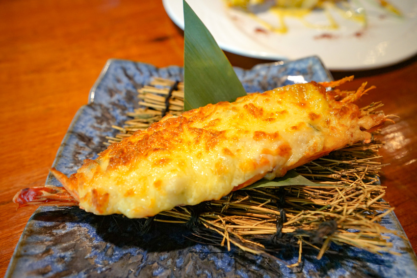 吃完前菜、沙拉和刺身後,進入到熟食的主題。很喜歡這雕之森樹屋餐廳兩道創意蝦料理,焗烤蝦上桌時熱騰騰些微燙口,香濃的起司與鮮蝦Q彈口感十分絕配。