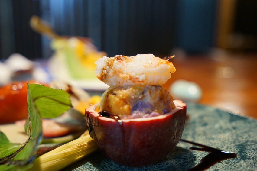 像是這個百香果薯泥毛蟹,小小一顆卻手工繁雜,底部使用埔里在地的百香果,中間放入地瓜、馬鈴薯和些許芋泥,最上面則是當季的日本毛蟹,入口可以吃到薯泥的綿密、百香果的酸甜和毛蟹的新鮮,口感層次豐富。