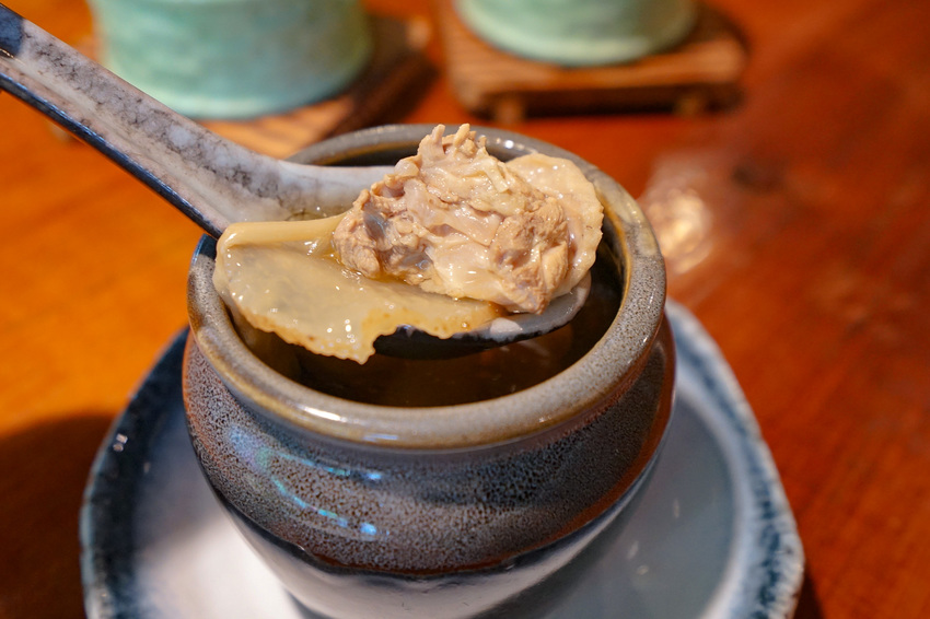 吃完小菜,服務人員上了兩甕湯品,兩甕不同風味的雞湯,大量使用埔里的特殊食材,像是山當歸、野薑花、猴頭菇等等,最特別的是添加了有「苦花」之稱的「佛手茄」,讓湯品帶了一點苦,但不像苦瓜湯一入口就有的苦感,而是在入喉後,一點點的苦、然後回甘。