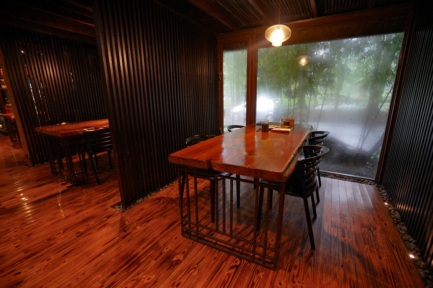 深色的木地板和充滿日式和風的佈景,配上水池中的鹽石以及玻璃落地窗,這時候忍不住讓人讚這雨下的好,讓這樣的空間更多了一絲禪意。