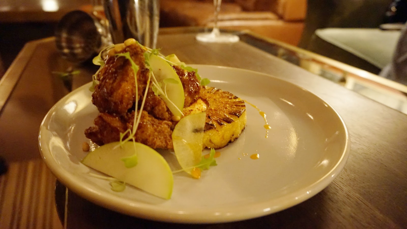 餐飲文化的感官挑戰,所以對於這裡的餐酒菜色搭配,將水準拉到至高,感到很驚艷! 平常我們常吃的日式唐揚炸雞,卻搭配了很臺灣味的百香果優格沾醬,再切一塊烤過的焦化鳳梨來解膩,一邊喝著調酒也能感到飽足感呢~Fine Dining 這幾年一直在接受