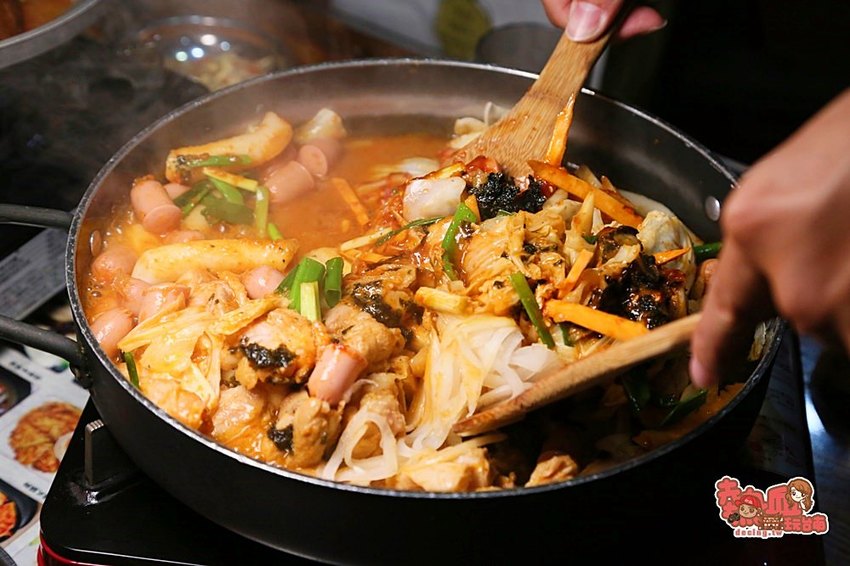 等鍋子平均受熱後,待周圍蔬菜稍微變軟,就可以將鍋內雞腿肉、年糕、鑫鑫腸等蔬菜辛香料拌炒,隨著食物受熱後那撲鼻而來的香氣,真是好玩又有趣,拌炒後那辛香料融入在雞腿肉、年糕等食物上,微辣微甜的口感真的好好吃~而且這份量也頗多的,多人共食也沒問題。
