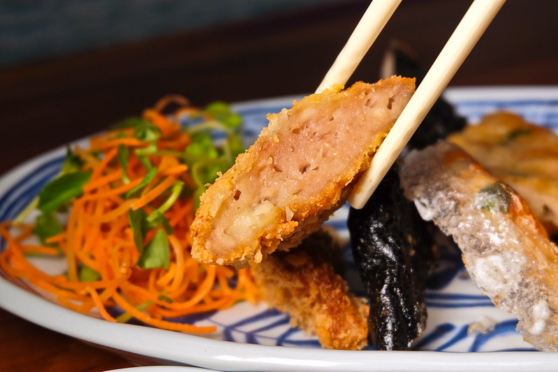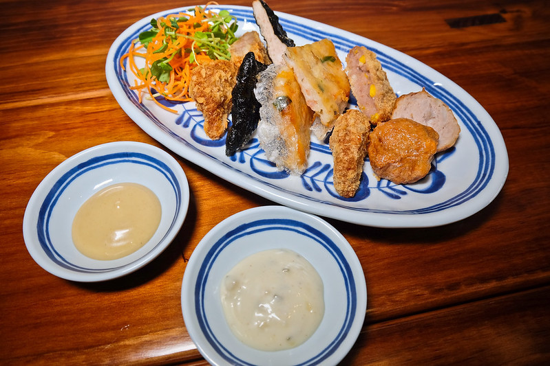 首先先來個海鮮炸物拼盤,這邊的拼盤有花豚丸、海苔花枝三明治、金錢玉米肉餅、脫袍蝦餅、花好月圓等一般不是很常見的炸物