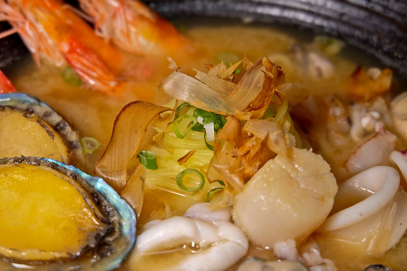 湯頭是前面提到那個旗魚骨+小魚乾+蛤蠣及洋蔥下去一起熬煮至少2-3小時的美味湯頭來配上味噌