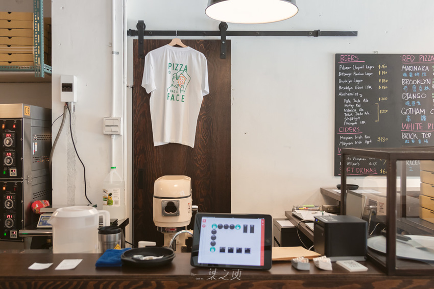 店內空間洗鍊俐落,有效地利用窄長的空間,讓客座區有著濃濃的美式感。細長的吧檯可以看見老闆在客人點單後才現烤,出爐時的陣陣香氣惹得在座的人更加飢腸轆轆。吧檯後方的牆上掛著印上和招牌相同的時尚披薩男(亂取名字XD) 因為太可愛了所以有稍微詢問過,衣服是當作周邊商品、有在販賣的喔!