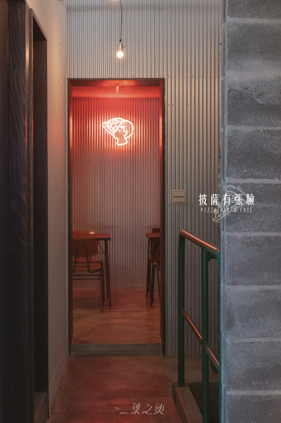 最深處還有一個小房間,裡頭掛上不同的霓虹招牌,是個長著臉的披薩(或是長著披薩的臉?) 紅色的光芒有點弔詭,但更多的是猶如酒吧一般的氛圍。