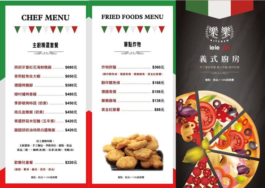 樂樂主推是手工薄皮pizza、嚴選義大利麵、私房饗宴套餐、主廚精選套餐