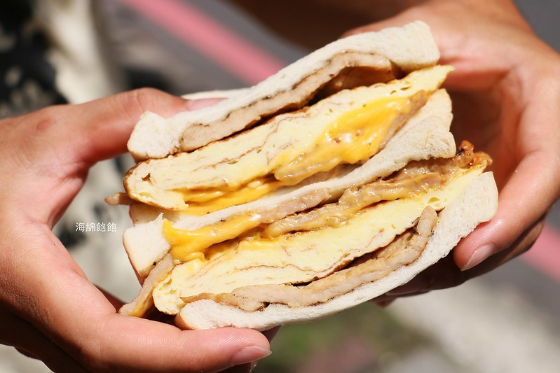 以土司夾著里肌豬肉片、歐姆蛋、起司片