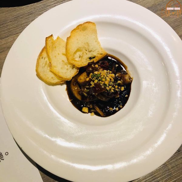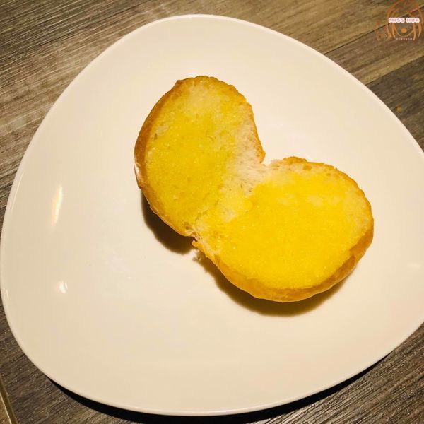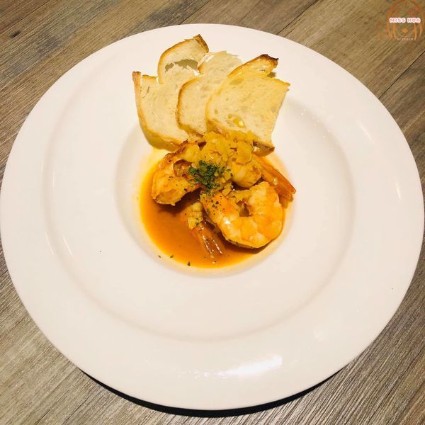 上面擺滿了蒜片,麵包沾著醬汁再配著鮮蝦吃,可以吃到蝦子的新鮮、濃醇香的醬汁味道