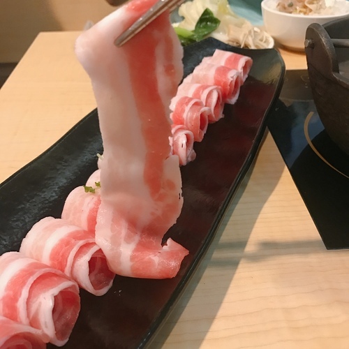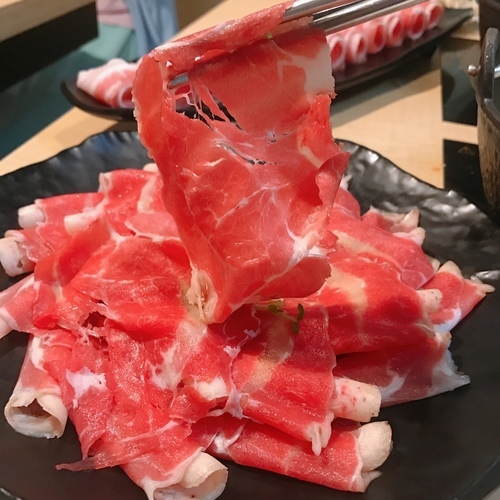 *🔸肉片切得較薄,輕輕夾起幾乎微透光,因為薄度關係,肉片吃起來沒有厚度的嚼勁感,煮完又會些微縮水,但一盤排成花狀的肉量頗多,整個套餐會吃得很飽