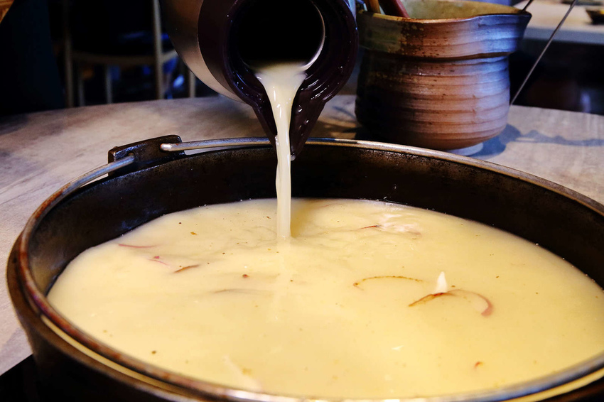 接下來,服務人員幫忙倒入火鍋湯底,之前已經有奶油爆香了,加入味噌口味的湯底更加濃郁了