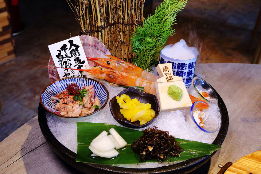 天使紅蝦刺身、山藥鮭魚卵、鮟鱇魚肝、黃金花枝、醃蘿蔔、水雲菜