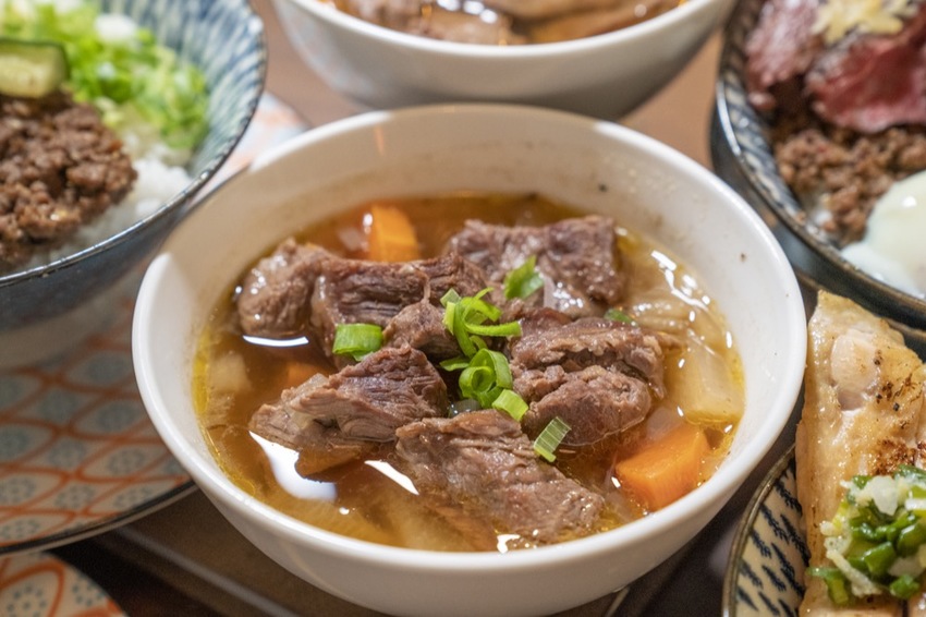 基底為清甜的蔬菜湯,再加上牛肉香氣微麻微辣的口味,整體喝起來鮮甜解膩。燉湯中除了有超級軟嫩好入口的牛筋肉,還有菜頭、蘿蔔點綴,一碗喝下肚不僅暖胃又暖心!