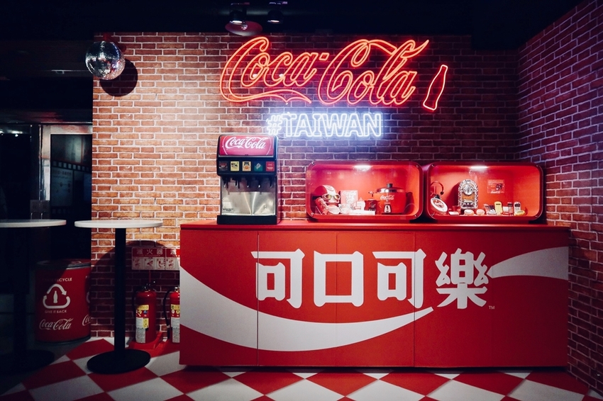 打造一間50年代的美式餐廳,內有點唱機、霓虹燈、老式冰箱和可口可樂餐具等樣樣俱全,還有一個是用可口可樂罐疊好疊滿的身高牆,真的超特別;裡面還有個櫥窗放置著5公升的可樂玻璃瓶,台灣最大的容量也才2公升,這5公升的超大容量銷售的國家是在墨西哥,但據說現在也停產囉!