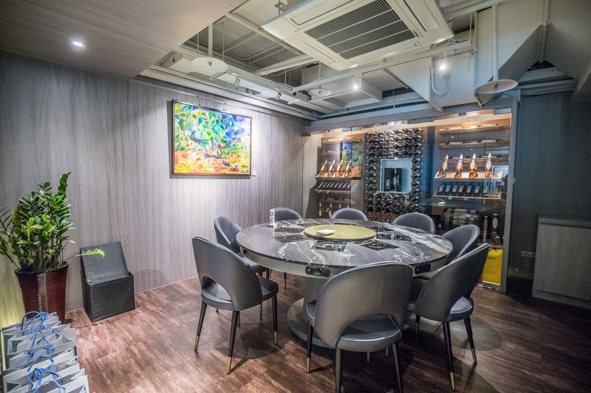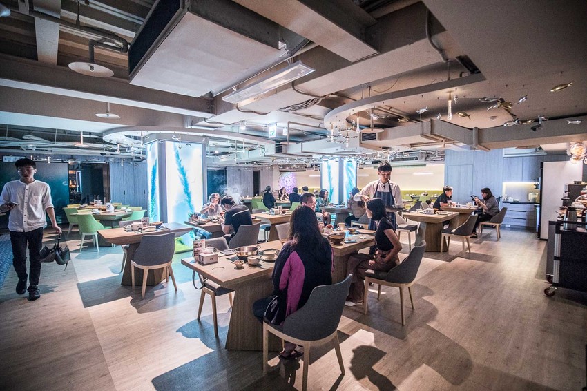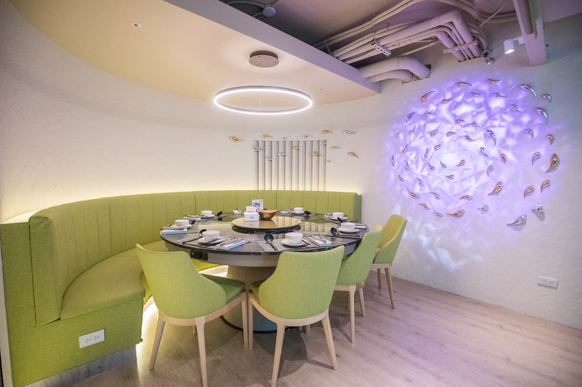 Hi-Q鱻食餐廳用餐區域佔地約150坪,除了開放式的座位區,也有3間寬敞的包廂及半開放式的大桌數座位,而且不限用餐時間,設計裝潢也是給人一種濃濃的海洋風格,天花板還吊掛了許多金銀小魚呢