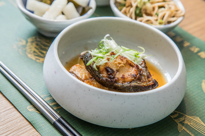鱸鰻一般都是煮湯藥膳,再不就是三杯,主廚選用吃褐藻長大的台灣鱸鰻,再以黑麻油乾煸老薑爆香,鱸鰻雙面煎至微焦起鍋,再淋上褐藻特調醬汁,乾煎褐藻鱸鰻的肉質很彈牙,調味鹹甜夠味,鹹香令人再三回味呢