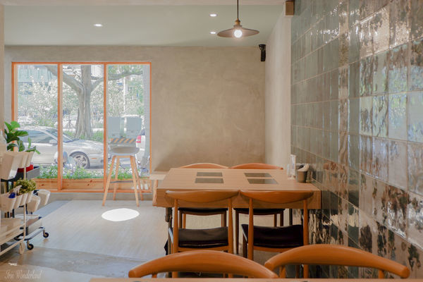 客人用餐的淺棕色木桌,呼應著整體淺色系裝潢和明亮燈光