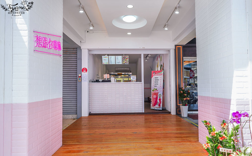 純白仿磚牆柱+霓虹亮粉「想跟你嗯嘛」帶點瞹昧俏皮的字樣,是店裡的人氣打卡點,是不是很適合帶朋友以上、戀人未滿的心儀對象來喝果汁呢?