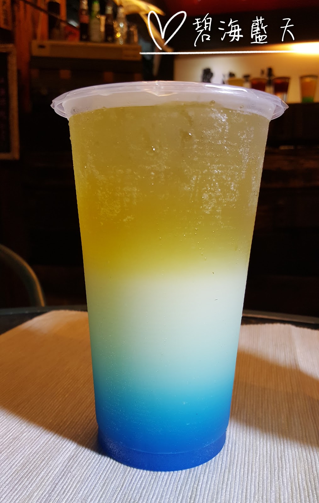 漸層飲料是利用各種液體比重不同而產生上下分層的效果,調這一杯卻也有點費工,若要漸層美麗,要很專心,手一晃上下層可能就混在一起了。碧海藍天先倒入檸檬多多,然後將藍柑橘自杯沿緩緩倒入,最後加入綠茶。
